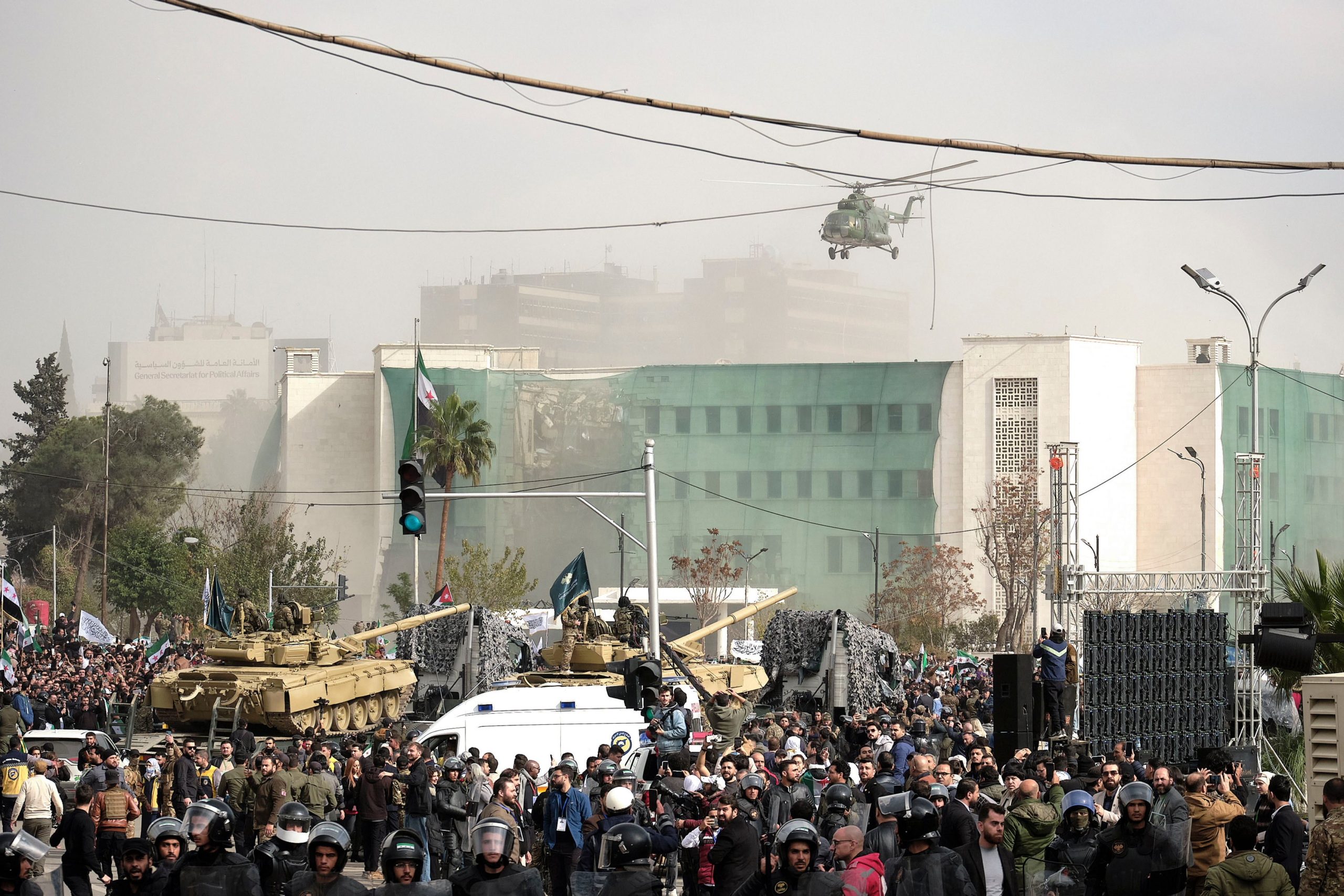 La plaza de los Omeyas ha sido sobrevolada por paracaidistas en una de las exhibiciones militares organizadas por el Ministerio de Defensa en distintos puntos del país para acompañar el aniversario. El presidente, Ahmed al Shara, ha acudido a la de la capital, tras rezar en la Mezquita de los Omeyas (vestido del uniforme militar con el que combatió en la guerra). Ha prometido “reconstruir una Siria fuerte, acorde con su presente y su pasado, de norte a sur y de este a oeste”.