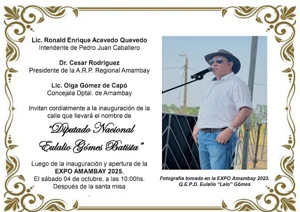 Este sábado se inaugurará en Pedro Juan Caballero la calle Diputado Nacional Eulalio Gomes, en homenaje al exdiputado fallecido en 2024.