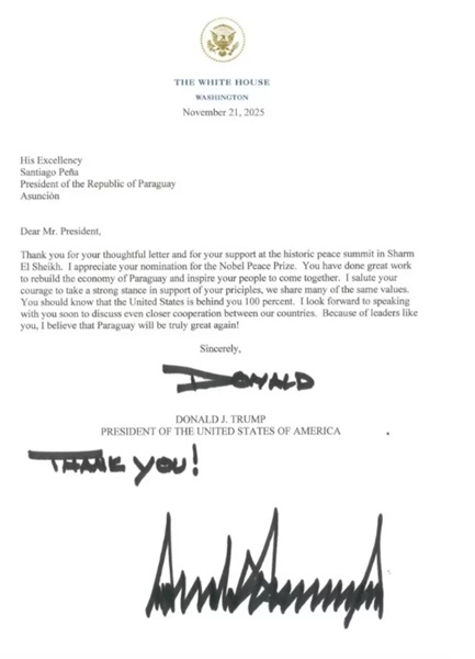 El presidente Santiago Peña propuso meses atrás al mandatario de Estados Unidos, Donald Trump, como candidato al Premio Nobel de la Paz. La nominación quedó expuesta a través de una carta emitida desde la Casa Blanca. El documento está fechado el 21 de noviembre de 2025. La misiva agradece el respaldo paraguayo y confirma que la postulación fue realizada por Peña.