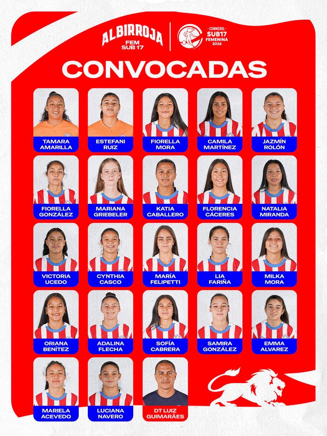 Lista de convocadas: Tamara Amarilla, Estefani Ruiz, Fiorella Mora, Camila Martínez, Jazmín Rolón, Fiorella González, Mariana Griebeler, Katia Caballero, Florencia Cáceres, Natalia Miranda, Victoria Ucedo, Cynthia Casco, María Felipetti, Lía Fariña, Milka Mora, Oriana Benítez, Adalina Flecha, Sofía Cabrera, Samira González, Emma Álvarez, Mariela Acevedo y Luciana Navero. Director técnico: Luiz Guimarães.