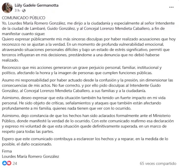 El comunicado resalta que las acciones previas perjudicaron gravemente el ámbito familiar y político del intendente y del concejal. “Pido disculpas al intendente Guido González y al concejal Lorenzo Mendieta”, reiteró la mujer tras el escándalo mediático generado. Ella sostiene que la situación también derivó en ataques y críticas directas hacia sus propios familiares cercanos.