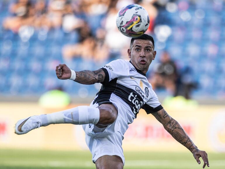 Derlis González, jugador de Olimpia, remata un balón en el partido frente a Sportivo Trinidense por la quinta fecha del torneo Apertura 2025 del fútbol paraguayo en el estadio Defensores del Chaco, en Asunción, Paraguay.