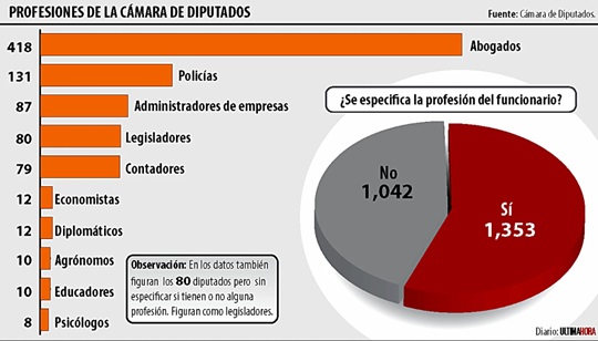 En cuanto a las profesiones declaradas, el análisis identificó 1.363 casos con datos específicos. La carrera de Derecho es la más frecuente, con 418 funcionarios registrados como abogados. Luego aparecen 131 policías, 87 administradores, 79 contadores, 12 economistas, 12 diplomáticos, 10 agrónomos, 10 educadores y 8 psicólogos. Además, 58 funcionarios figuran como bachilleres. Los 80 diputados aparecen en la planilla con la categoría de “legisladores”.