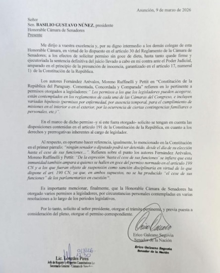 El senador colorado Erico Galeano solicitó formalmente un permiso a la Cámara de Senadores luego de la condena que recibió en el marco de la causa A Ultranza Py. El legislador planteó apartarse temporalmente de sus funciones hasta que la sentencia quede firme en el ámbito judicial.