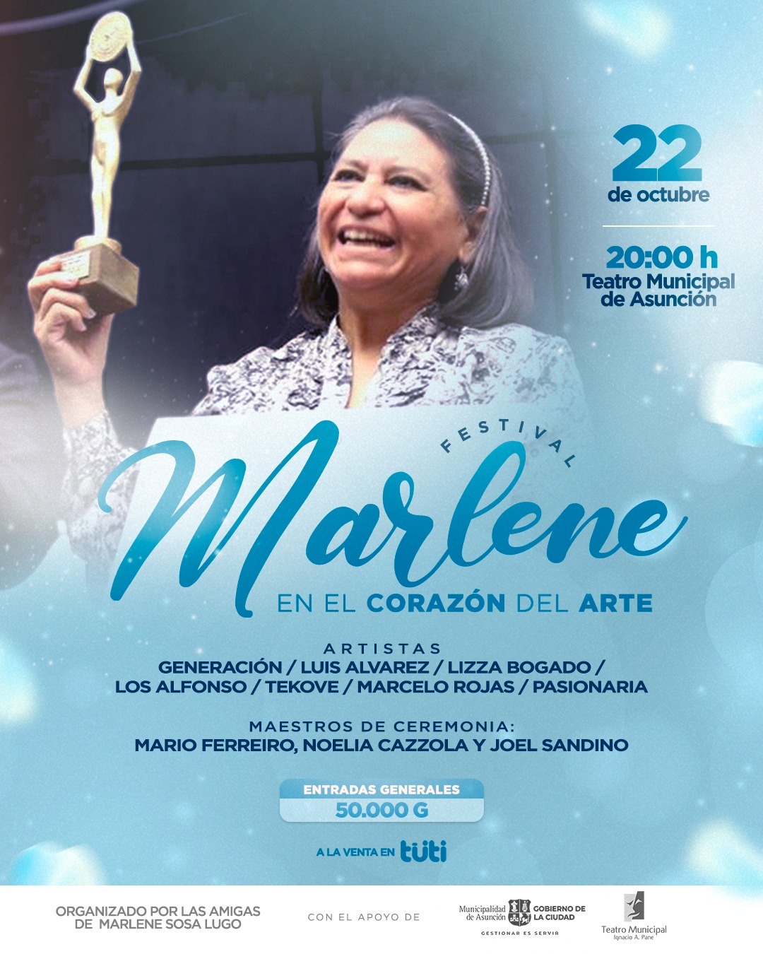 Este evento está organizado por los amigos de Marlene, con el apoyo del Teatro Municipal Ignacio A. Pane y la Municipalidad de Asunción.
