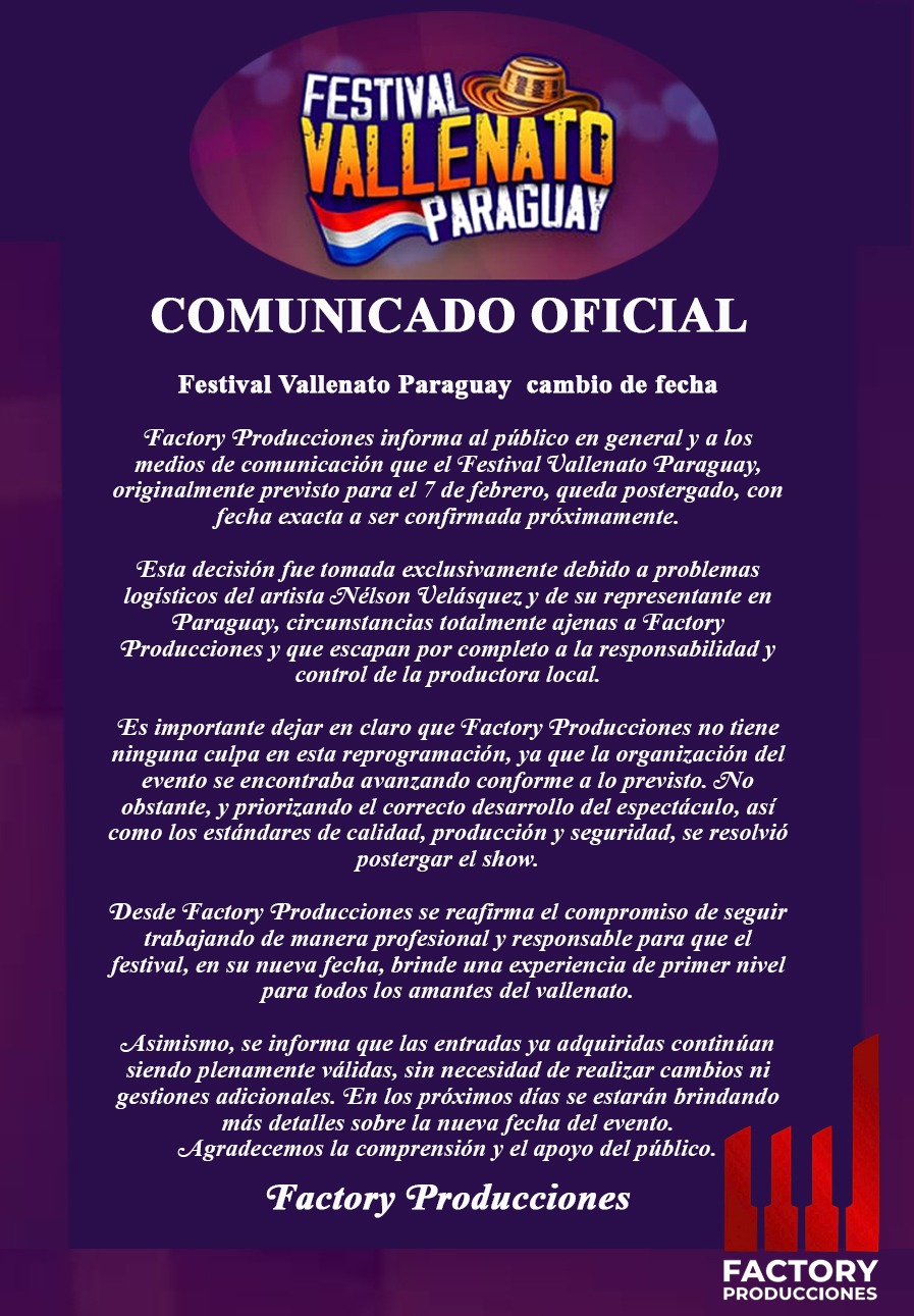 Factory Producciones informa al público en general y a los medios de comunicación que el Festival Vallenato Paraguay, originalmente previsto para el 7 de febrero, queda postergado, con fecha exacta a ser confirmada próximamente.