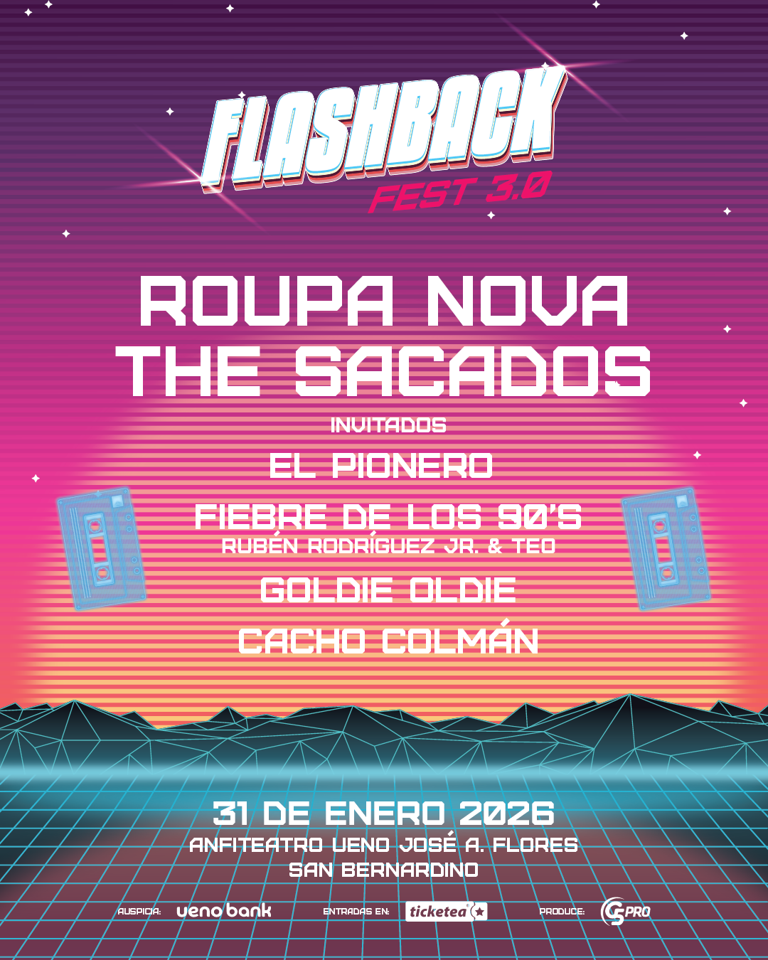 FLASHBACK FEST Edición Verano ’26 es apto para todo público, menores de hasta 10 años cumplidos no abonan ingreso acompañados de su adulto responsable con entrada.