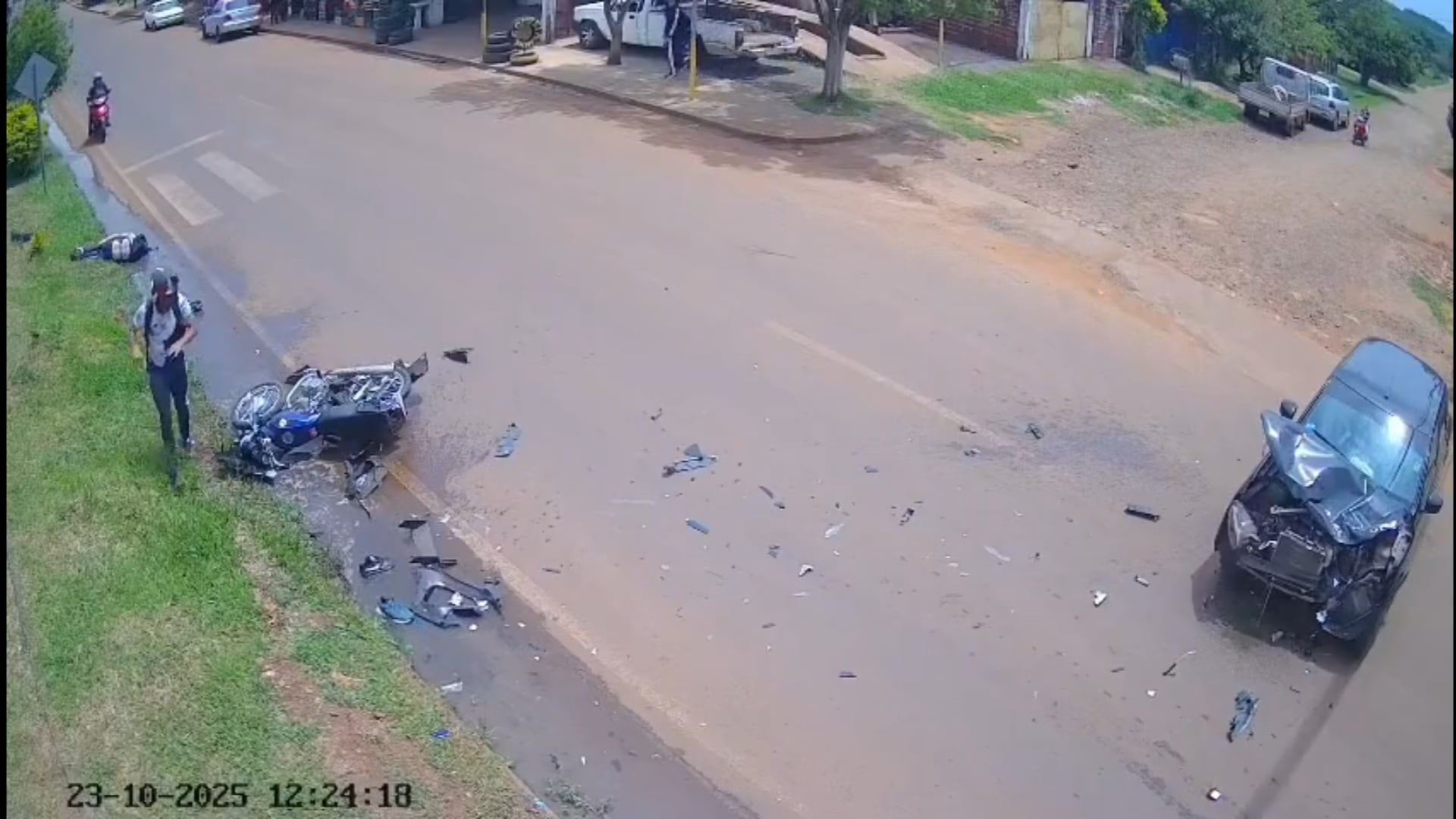 El video muestra que el conductor de la motocicleta se levantó, dio varios pasos al rededor de la moto y hasta se sacó el caso, dando señales de que en principio no habría recibido golpes de gravedad.
