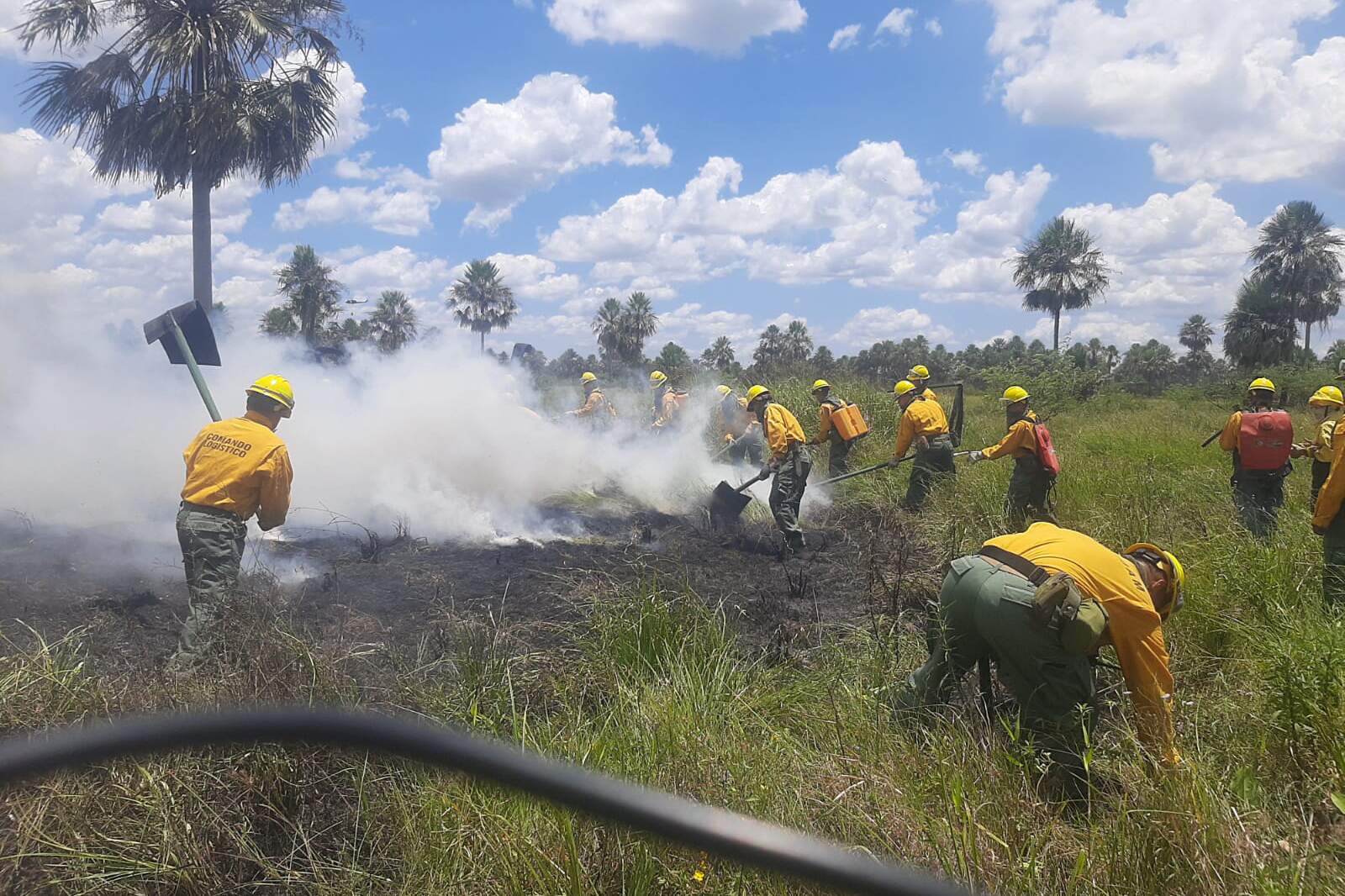 La ubicación del fuego obligó al despliegue de un helicóptero de la Fuerza Aérea Paraguaya para transportar a bomberos voluntarios y personal militar especializado en combate a incendios forestales al área del siniestro.