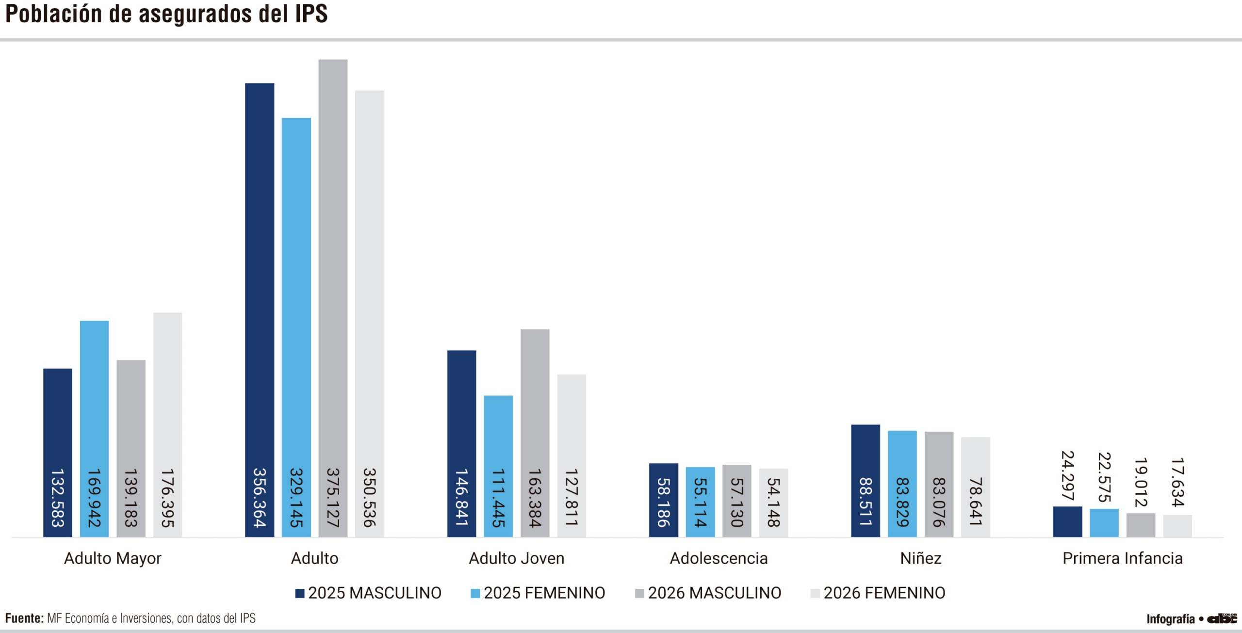 El segmento de primera infancia también presenta una baja. Los asegurados masculinos se reducen de 24.297 en 2025 a 19.012 en 2026, mientras que las mujeres pasan de 22.575 a 17.634. Este es uno de los cambios más notorios en términos relativos, lo que podría vincularse a una menor incorporación de nuevos dependientes en el sistema.