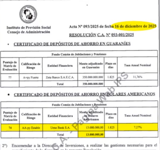 El Instituto de Previsión Social (IPS) volvió a quedar en el centro de la atención pública tras autorizar una nueva colocación de fondos en el banco ueno, entidad vinculada a exsocios del presidente de la República, Santiago Peña. La operación fue aprobada el 16 de diciembre por mayoría del Consejo de Administración y formalizada mediante la resolución CA Nº 093-001/2025.
