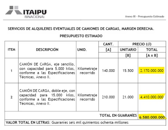 Del lado paraguayo, la Itaipú Binacional está dirigida por Justo Zacarías Irún, exgobernador de Alto Paraná y exdiputado por el Partido Colorado. Bajo su gestión, el proceso distingue dos tipos de servicios: por un lado, camiones de eje simple con capacidad de hasta 5.000 kilos, cuyo costo estimado ronda los G. 2.170 millones; y por otro, camiones de doble eje con capacidad de hasta 15.000 kilos, por un monto aproximado de G. 4.410 millones.