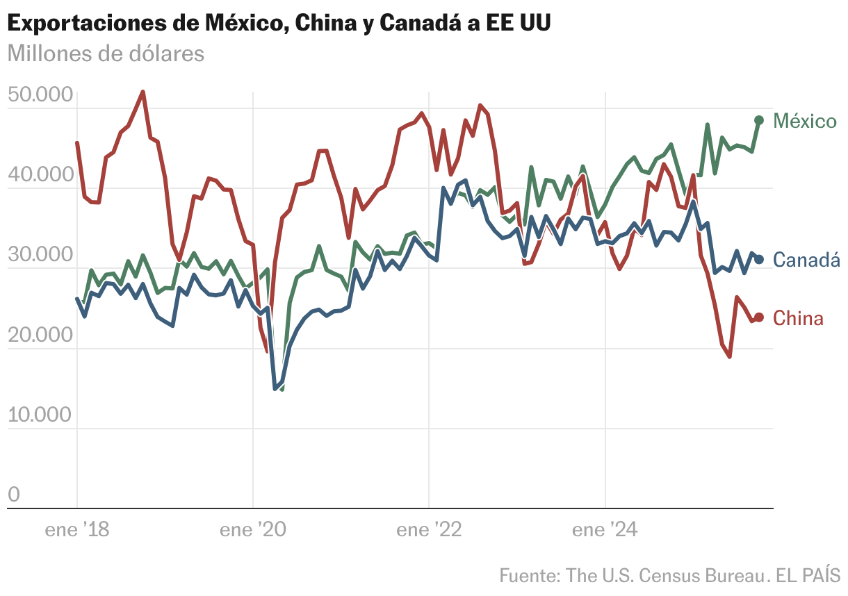A pesar de que Trump ha impuesto aranceles sectoriales contra el acero y el aluminio, así como a los productos fuera del TMEC, México ha logrado sortear estos vendavales y ha mantenido el ritmo ascendente en las exportaciones a EE UU. Las cifras oficiales dan cuenta de que después de México, los principales exportadores al mercado estadounidense en los primeros 10 meses de 2025 fueron Canadá con una participación del 12,9%; China con 7,6%; Taiwán con 4,3% y Alemania con 4,2%. La segunda economía de América Latina sigue siendo el principal proveedor de Estados Unidos, después de desplazar a China en 2023.
