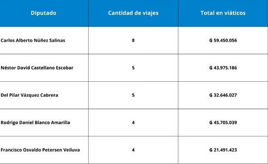 Entre los legisladores que más misiones internacionales realizaron aparece Carlos Alberto Núñez Salinas. Según los registros, el diputado efectuó ocho viajes al exterior y recibió G. 59.450.056 en concepto de viáticos.