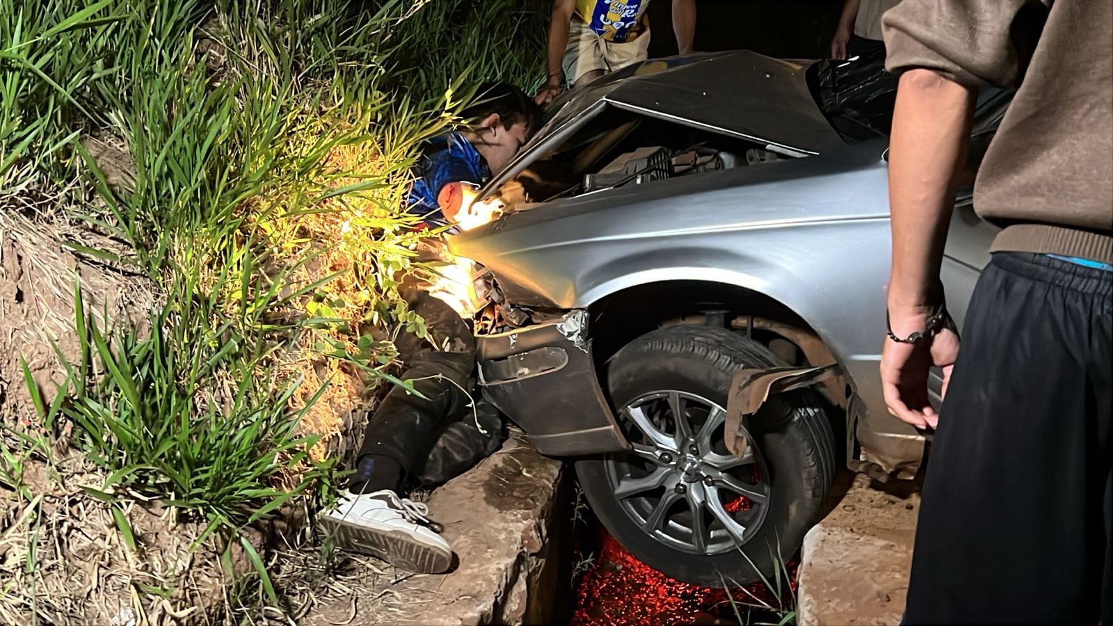 En el biciclo viajaban Esteban Ramón Villalba, quien conducía, y su pareja. Tras el impacto, Villalba quedó atrapado entre el vehículo y el suelo, por lo que bomberos voluntarios tuvieron que intervenir para liberarlo.