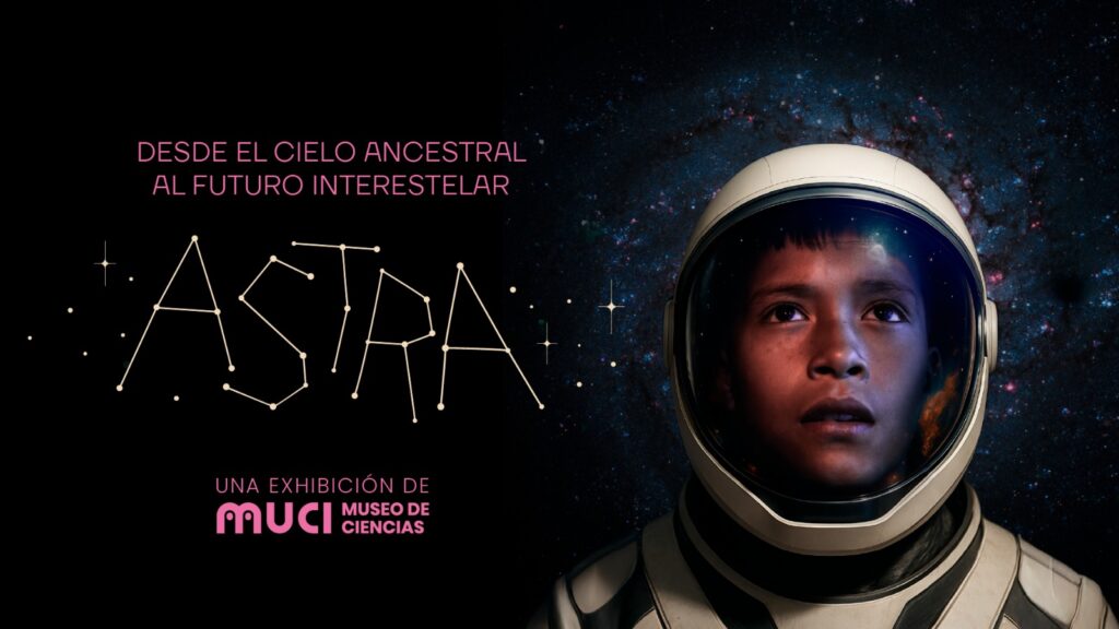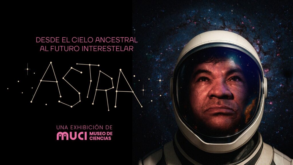ASTRA es una muestra visual y sensorial que propone un viaje en el que el pasado y el futuro conviven en un mismo espacio-tiempo. Su imagen central —una figura guaraní con casco de astronauta— representa la unión entre el legado ancestral y las preguntas que nos proyectan hacia las estrellas.