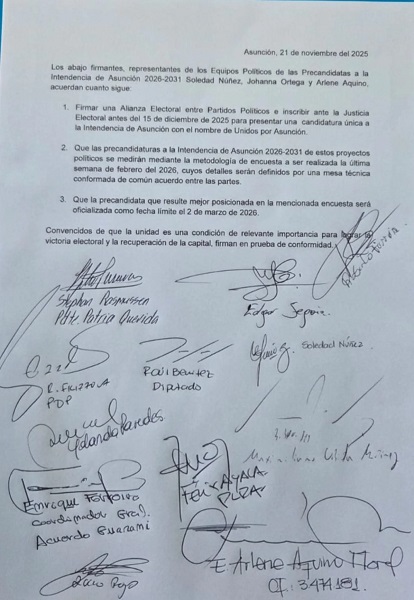 Con esta firma, la oposición busca llegar unida a las elecciones de Asunción 2026, potenciando la competitividad de su plataforma y consolidando la cooperación entre sus distintos sectores políticos. La unidad también incluye la coordinación de campañas y estrategias conjuntas de comunicación hasta la fecha de los comicios.