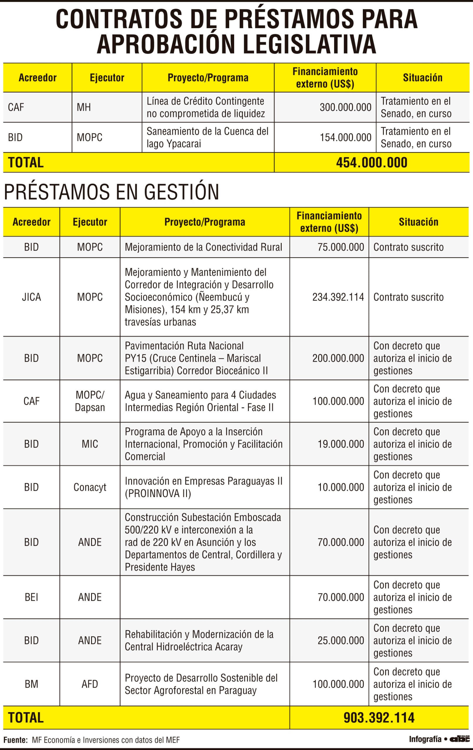A febrero de 2026, Paraguay mantiene en agenda un conjunto significativo de financiamiento externo que apunta a ser destinado a proyectos de inversión y que sumaría US$ 1.357.392.114 entre contratos para aprobación legislativa y préstamos en gestión, de acuerdo con los datos del Ministerio de Economía y Finanzas (MEF).