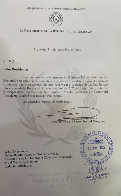 El presidente de la República, Santiago Peña, alista una nueva salida oficial del país. Este viernes comunicó al Congreso Nacional que viajará mañana, 8 de noviembre, a La Paz, Bolivia, para participar de la ceremonia de transmisión de mando y asunción del presidente electo Rodrigo Paz Pereira.