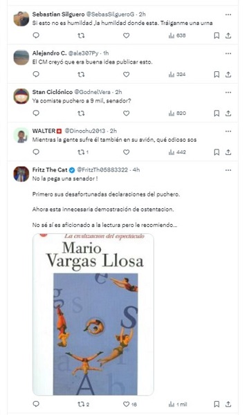 Esta vez, la reacción ciudadana fue contundente. Usuarios ironizaron sobre la falta de empatía del senador. Algunos cuestionaron cómo alguien que llama a conformarse con puchero barato puede presumir un avión privado, en un país donde miles de familias luchan por cubrir necesidades básicas.