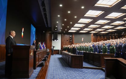 El presidente ruso, Vladímir Putin, solía ser más comedido al usar insultos contra quienes considera sus enemigos, pero este miércoles, ante su plana mayor, ha dejado entrever la influencia de los halcones más radicales del Kremlin al usar su misma retórica. “Todos pensaron que destruirían Rusia en poco tiempo, los cochinillos europeos se unieron a la anterior administración estadounidense con la esperanza de lucrarse con el colapso de nuestro país”, ha manifestado Putin ante sus generales. El mandatario ruso ha asegurado que las advertencias europeas sobre un posible conflicto futuro con Rusia son producto de la “histeria” y “mentira”, aunque en ese mismo acto ha anunciado la puesta “en servicio de combate” de su nuevo misil balístico e hipersónico Oréshnik y ha declarado que “culminará todos sus objetivos en Ucrania aunque sea por la fuerza”.