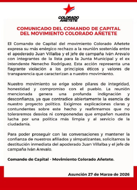 El reclamo no se limita a una explicación pública. Añeteté solicitó la salida de dos figuras clave de la campaña. “Solicitamos la destitución inmediata del apoderado Juan Villalba y el jefe de campaña Iván Arévalo”, expresa el texto.