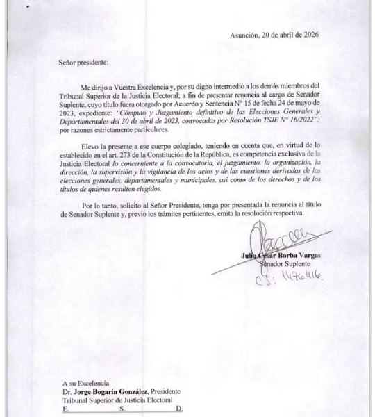 Julio Borba renunció formalmente a su cargo de senador suplente ante el Tribunal Superior de Justicia Electoral (TSJE). El exministro de Salud remitió la nota al presidente de la institución, Jorge Bogarín González, citando razones particulares.