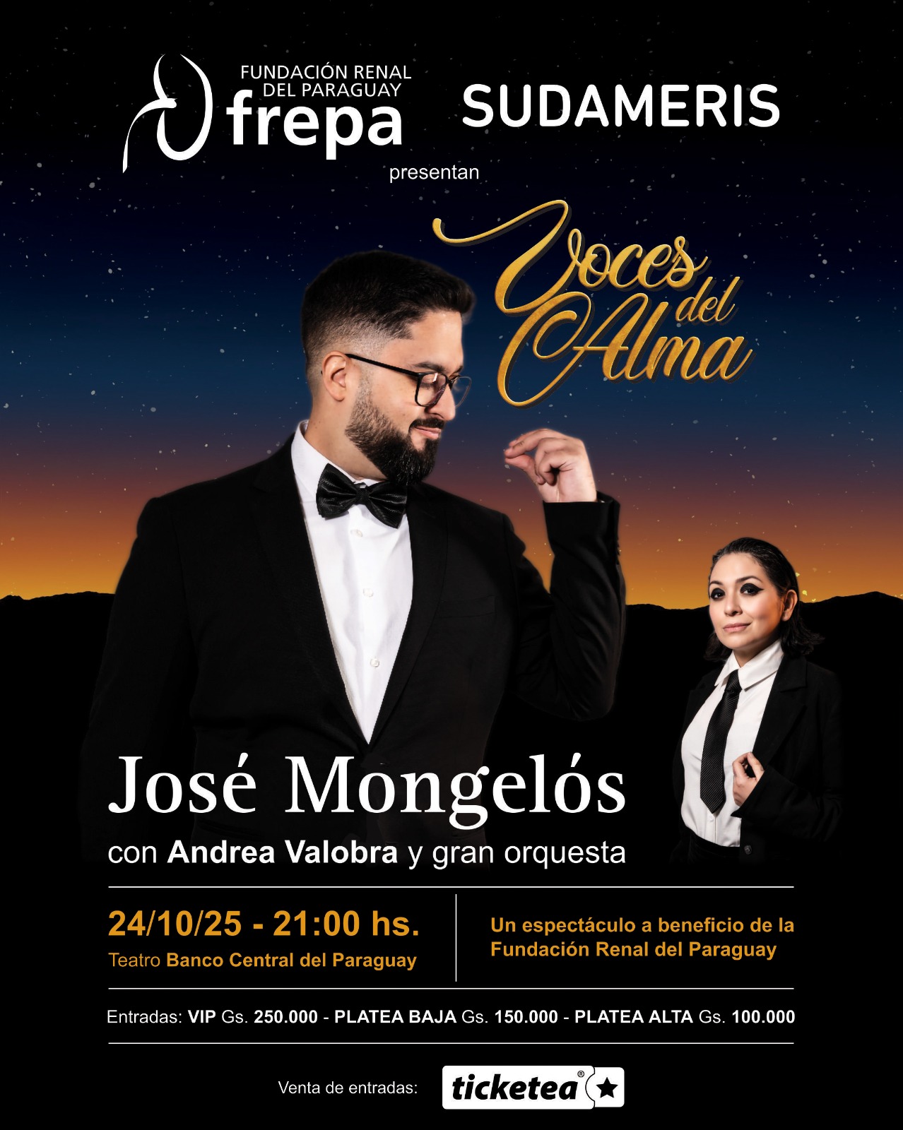 El viernes 24 de octubre de 2025, a las 21:00, el Teatro José Asunción Flores del Banco Central del Paraguay será escenario del espectáculo “Voces del Alma”, una gala al estilo Broadway, encabezada por el tenor José Mongelós, junto a la reconocida artista Andrea Valobra. Más allá de la música y la cultura, esta velada tiene un propósito solidario: recaudar fondos para la Fundación Renal del Paraguay (FREPA), que desde hace más de 26 años brinda apoyo integral a pacientes pediátricos y adultos renales de escasos recursos de los principales hospitales del país.